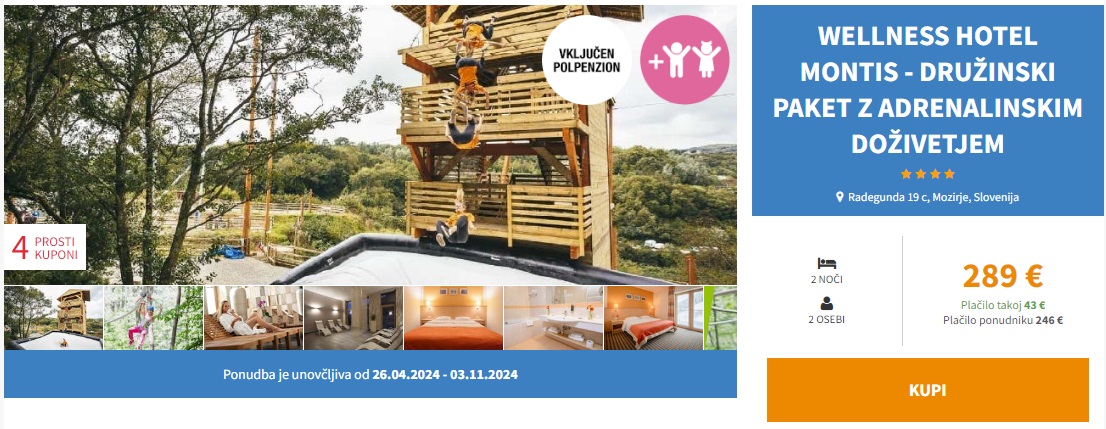 1x adrenalinsko doživetje za celo družino: adrenalinski park ali rollercoaster zipline (1 spust/oseba) ali prosti pad (1 skok/oseba) ali uporaba slide & jump ploščadi (do 1 ure) (pomlad in jesen obratuje ob vikendih, poletje vse dni; obratovalni čas v opombah)*