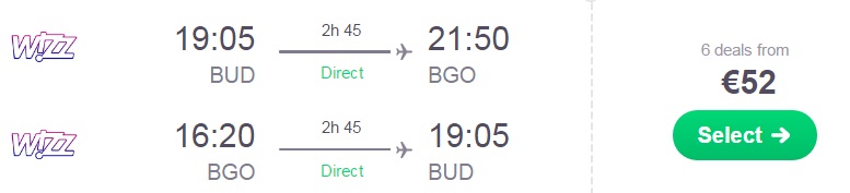 Budimpešta (BUD) – Bergen (BGO) – Budimpešta (BUD), že za 52 eur (ang. povezava skyscanner)