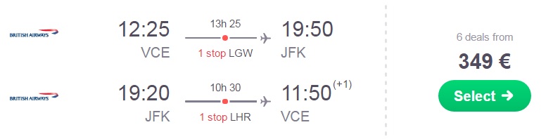 Benetke (VCE) – New York (JFK) – Benetke (VCE), že za 349 eur (ang. povezava skyscanner)