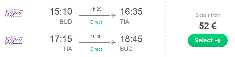 Primer povratne letalske povezave iz Budiimpešte v Tirano (npr. termin 28.05.-31.05.2017):