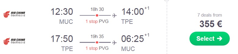 Munchen (MUC) – Tajpej (TPE) – Munchen (MUC), že za 355 eur (ang. povezava skyscanner)