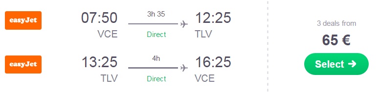 Benetke (VCE) – Tel Aviv (TLV) – Benetke (VCE), že za 65 eur (angl. povezava skyscanner.com)