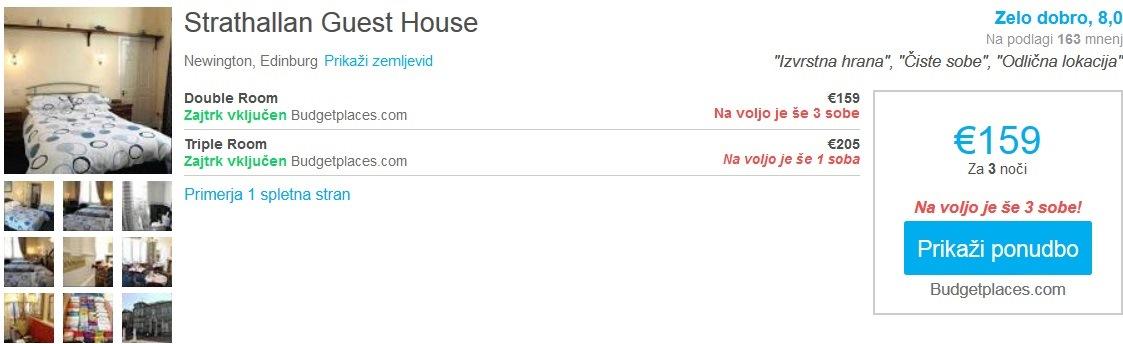 Bologna – Edinburg, Ryanair, prtljaga ni vključena, 70 eur/oseboPrimer hotelske namestitve v Edinburgu (03.03.-06.03.2017):