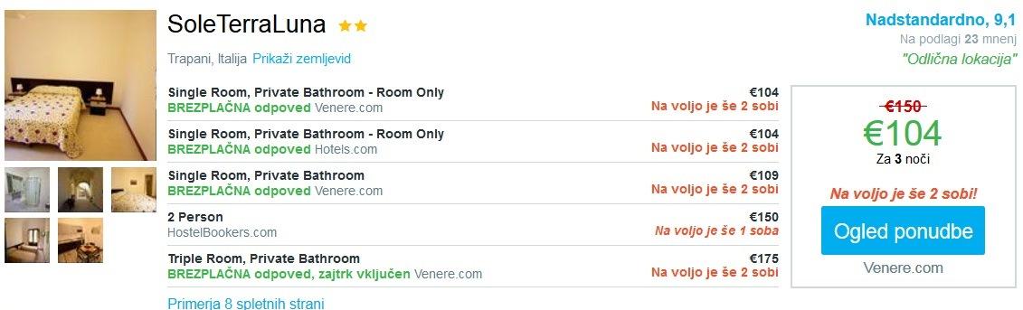 V Trapaniju so na voljo 3 nočitve (za termin 06.11.- 09.11.2015) v zelo dobro ocenjenem B&B v centru mesta SoleTerraLuna, kjer je cena za dve osebi od 104 eur. Zelo dobro oceno omenjeni nastanitvi so namenili tudi gostje na portalu Trip Advisor (klikni TUKAJ).