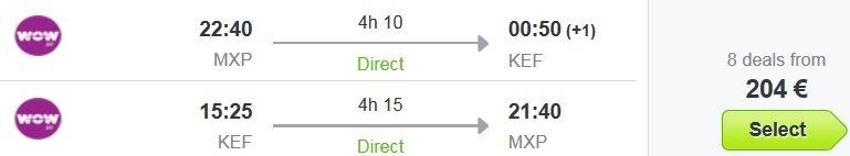 Primer povratne letalske povezave iz Milana na Islandijo (npr termin 13.09.-20.09.2016):