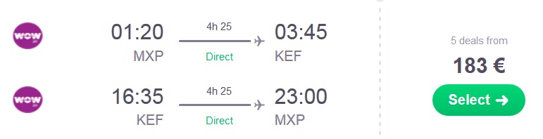 Milano (MXP) – Reykjavik (KEF) – Milano (MXP), že za 183 eur (ang. povezava skyscanner)