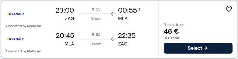 Zagreb (ZAG) – Malta (MLA), že za 46 eur
