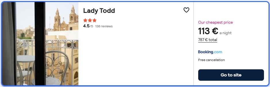 Seštevek cene primera paketa (letalo + nastanitev) za 7 noči bivanja na Malti tako znaša 879 eur za dve osebi (oz. 440 eur na osebo).