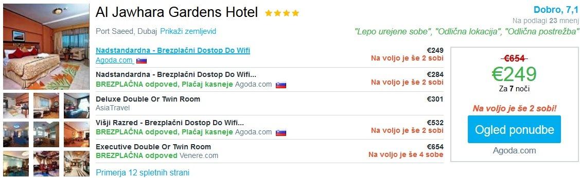 V Dubaju je na voljo 7 nočitev (za termin 30.7.-6.8.2016) v zelo dobro ocenjenem hotelu s 4*Al Jawhara Gardens Hotel, kjer je cena za dve osebi že od 249 eur. TripAdvisor oceno si lahko ogledate TUKAJ.