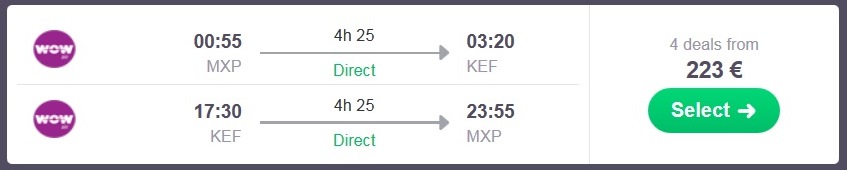 Milano (MXP) – Reykjavik (KEF) – Milano (MXP), že za 223 eur (ang. povezava skyscanner)