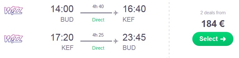 Informacija o letu: direktni let, prtljaga ni vključenaPrimer povratne letalske povezave iz Budimpešte na Islandijo (npr termin 05.05.-19.05.2017):