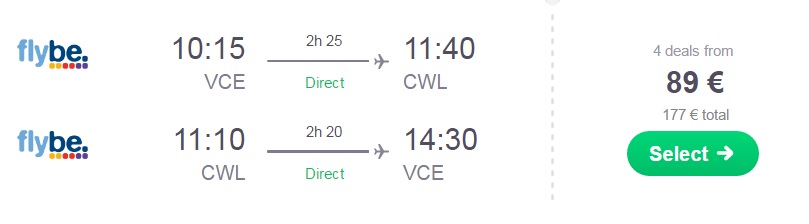 Skupna cena celotnega paketa 4 dnevnega dopusta za dve osebi (letalo + hotel) v Cardiffu tako znaša 417 eur (oz. 208 eur na osebo).