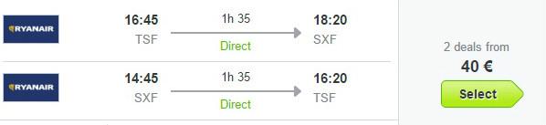 Ugodne letalske karte vam omogoča nizkocenovnik Ryanair z odhodom iz Trevisa, kjer je povratna letalska povezava za navedeni termin na voljo, že za 40 eur na osebo (v ceno ni vključena check in prtljaga, z izjemo manjše osebne prtljage ki jo vzamete na krov).
