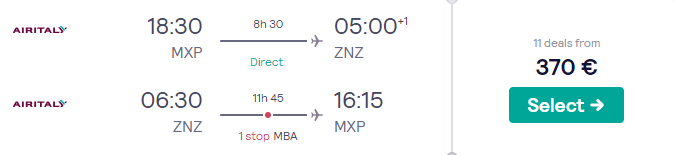Primer povratne letalske povezave iz Milana na Zanzibar (npr. 19.03. – 27.03.2020)