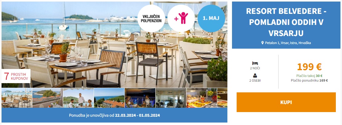 POMLADNI ODDIH V VRSARJU! 2 noči s polpenzionom v Resort Belvedere že za 199 eur (2 osebi) (otrok gratis)