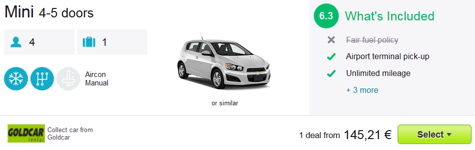 Najem avtomobila na letališču v Olbiji, že od 145 eur za 7 dniSkupna cena celotnega paketa 7 dnevnega dopusta za dve osebi (letalo + avtorent) na Sardiniji, tako znaša 289 eur (oz. 145 eur na osebo).