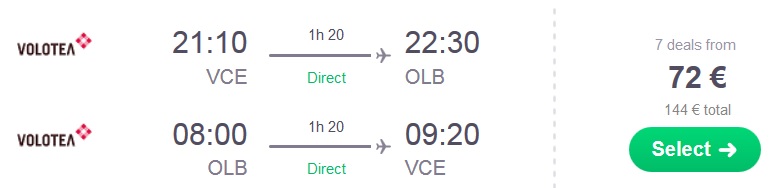 Benetke – Olbia; Volotea; check in prtljaga ni vključena, 72 eur