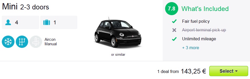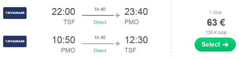 Benetke – Palermo; Ryanair; Najem avtomobila na letališču v Palermu, že od 144 eur za vse dniSkupna cena celotnega paketa 7 dnevnega dopusta za dve osebi (letalo + avtorent) na Siciliji, tako znaša 270 eur (oz. 135 eur na osebo).