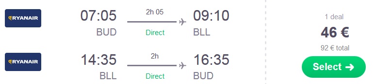 Budimpešta-Billund; Ryanair, check in prtljaga ni vključena, 46 eur/osebo