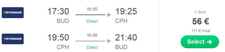 Budimpešta-Kopenhagen; Ryanair, check in prtljaga ni vključena, 56 eur/osebo