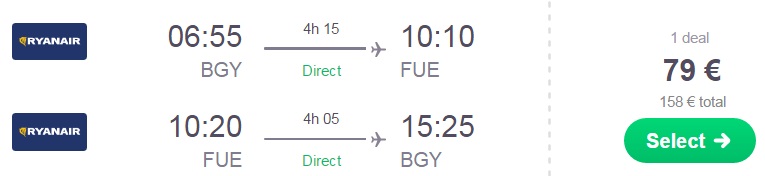 Milano – Fuerteventura, Ryanair, prtljaga ni vključena, 79 eur/osebo