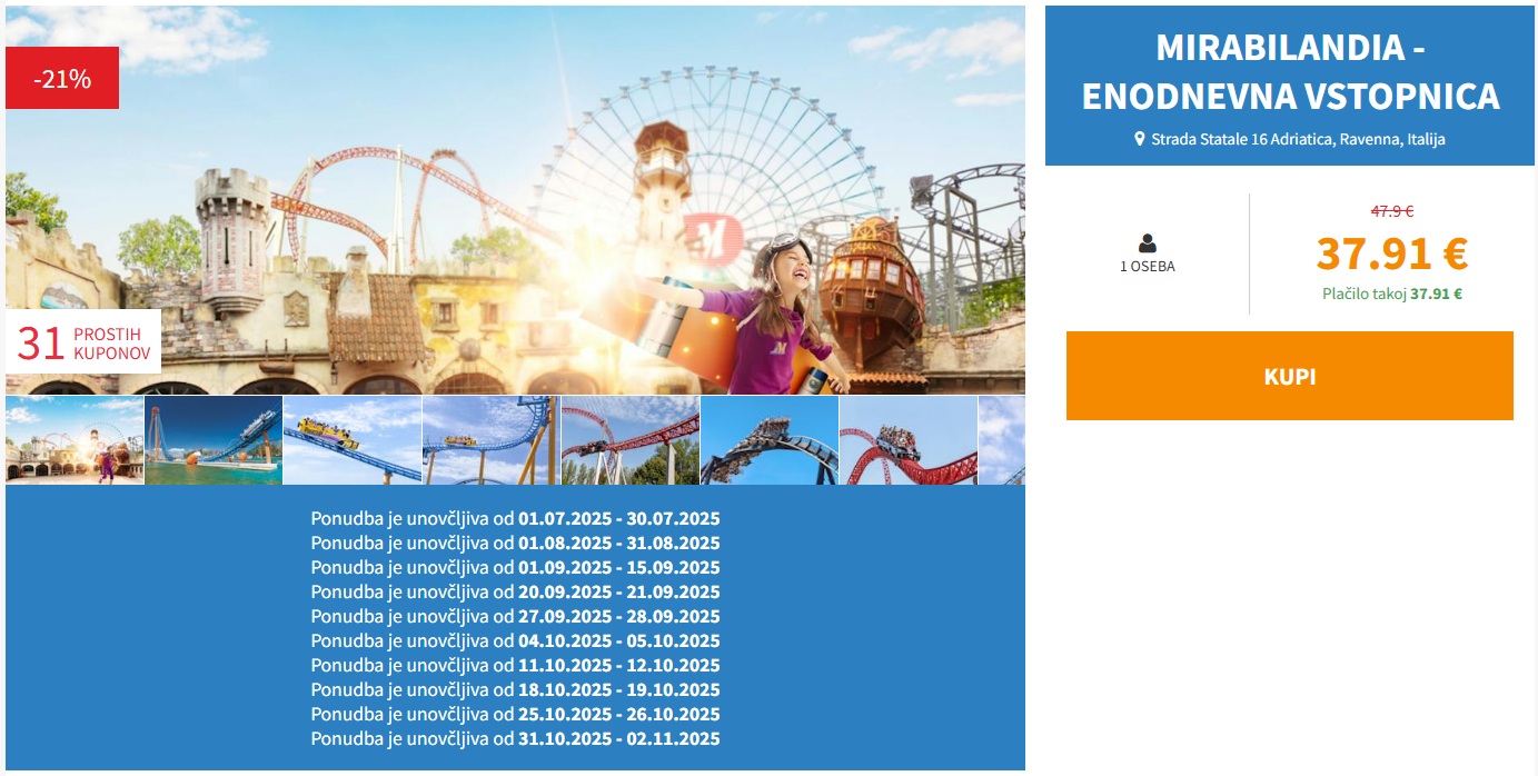 PREDLOG ZA POLETNI IZLET! Mirabilandia (enodnevna vstopnica) že za 37,91 eur na osebo