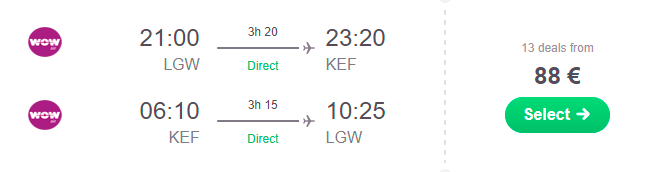 London (LGW) – Reykjavik (KEF) – London (LGW), že za 88 eur (ang. povezava skyscanner)