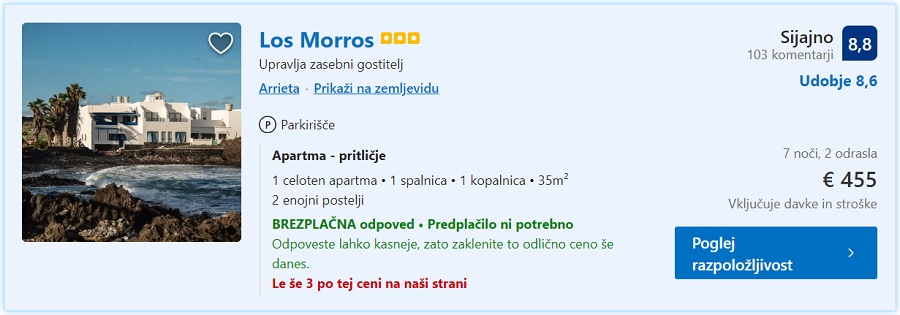 Primer nočitev na otoku Lanzarote