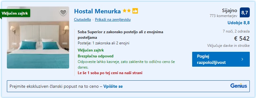 7 noči Menorke, Hostal Menurka, 542 eur (27.04.-04.05.2022),za 2osebi z zajtrkom