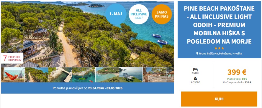 PRVOMAJSKA DALMACIJA! 2 noči All Inclusive v Pine Beach Pakoštane 3* že za 399 eur (3 osebe)