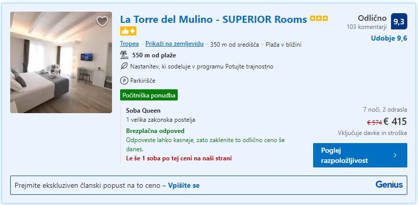 Seštevek cene primera paketa (letalo + nastanitev) za 7 noči bivanja na Kalabriji (Tropea) tako znaša 475 eur za dve osebi (oz. 238 eur na osebo).