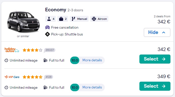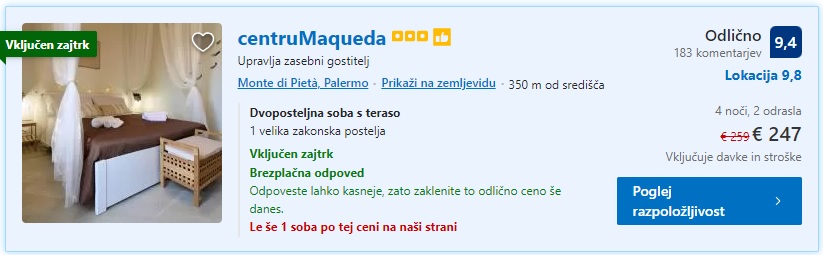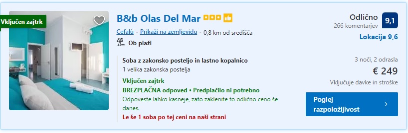 Seštevek cene primera paketa (letalo + nastanitev + najem avtomobila) za 7 noči bivanja na Siciliji tako znaša 882 eur za dve osebi (oz. 441 eur na osebo).