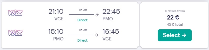 Benetke (VCE) – Palermo (PMO), že za 22 eur