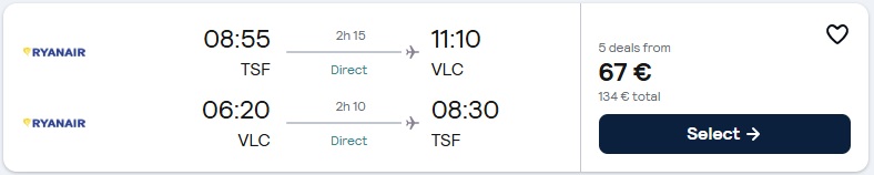 Treviso (TSF) – Valencija (VLC), že za 67 eur