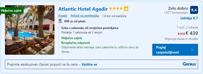 Seštevek cene primera paketa (letalo + nastanitev) za 7 noči bivanja za dve osebi v Agadirju tako znaša 531 eur (oz. 266 eur na osebo).