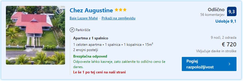 9 nočitev Sejšeli (Mahe), 25.04.-04.05.2022, Chez Augustine, od 720 eur/2 osebi