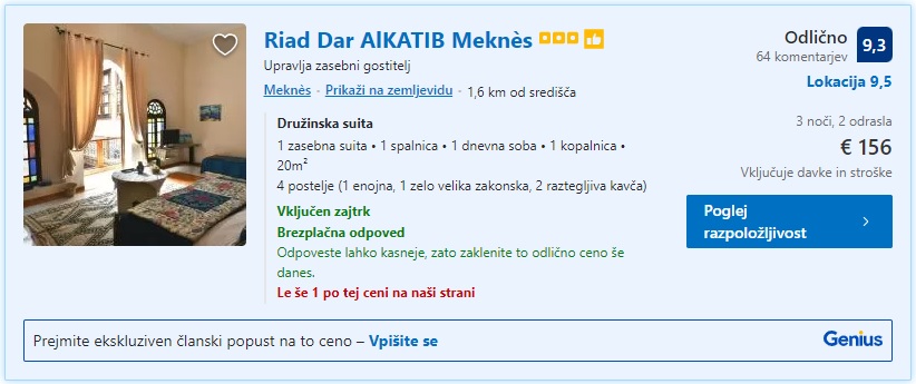 3 nočitve z zajtrkom Meknes, 26.-29.04.2022, Riad Dar AIKATIB Meknes, 156 eur/2 osebi
