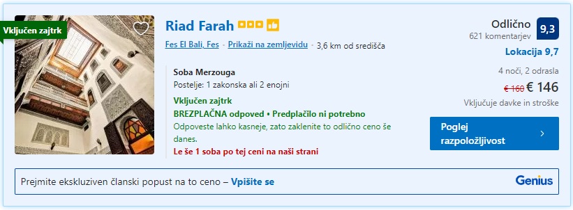 4 nočitve z zajtrkom Fez, 25.12.-27.12.2021, Riad Farah, 146 eur/2 osebi