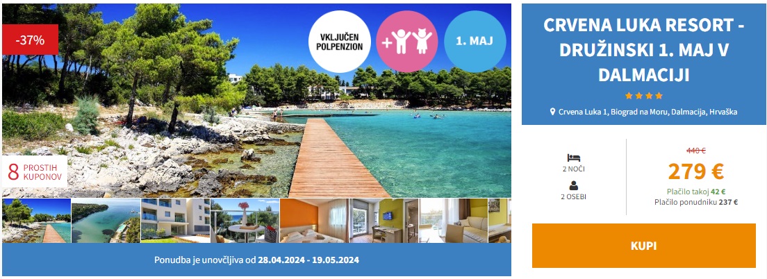 PRVOMAJSKI ODDIH V DALMACIJI! 2 noči s polpenzionom v Crvena Luka Resort 4* že za 279 eur (2 osebi)(2 otroka gratis)