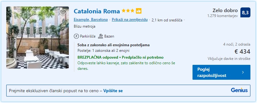 Seštevek cene primera paketa (letalo + nastanitev) za 4 noči bivanja za dve osebi v Barceloni tako znaša 518 eur (oz. 259 eur na osebo).