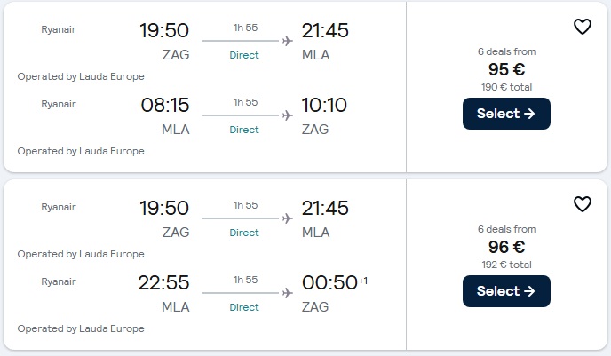 Zagreb (ZAG) – Malta (MLA), že za 95 eur