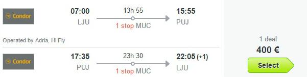 Ljubljana (LJU) – Punta Cana (PUJ) – Ljubljana (LJU) že za 400 eur (ang. skyscanner.net)
