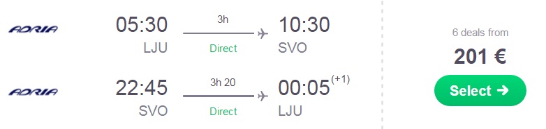Informacija o letu: brez postanka, check in prtljaga NI vključena, vključeno 8 kg ročne prtljagePrimer povratne letalske povezave iz Ljubljane v Moskvo (npr termi 06.02.-11.02.2018):