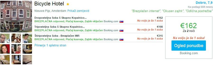 V Amsterdamu sta na voljo 2 nočitvi (za termin 11.04.- 13.04.2016) v zelo dobro ocenjenem hotelu Bicycle Hotel, kjer je cena za dve osebi z zajtrkom že od 162 eur. TripAdvisor oceno si lahko ogledate TUKAJ.