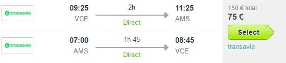 Ugodne letalske karte vam omogoča nizkocenovnik Transavia z odhodom iz Benetk, kjer je povratna letalska povezava za navedeni termin na voljo, že za 75 eur na osebo (v ceno ni všteta prtljaga, z izjemo brezplačne manjše osebne prtljage do 10kg).