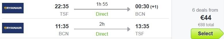 letaloTreviso- Barcelona, Ryanair, prtljaga ni vključena, 44 eur/osebo