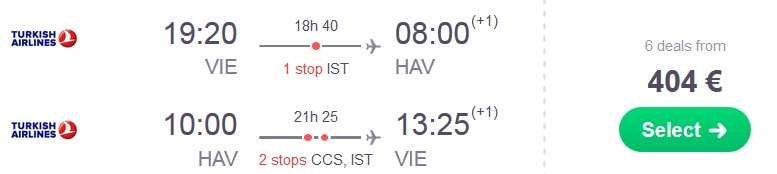 Informacija o letu: 1 -2 postanka, prtljaga vključenaPrimer povratne letalske povezave z Dunaja na Kubo (npr 03.01.-23.01.2018):