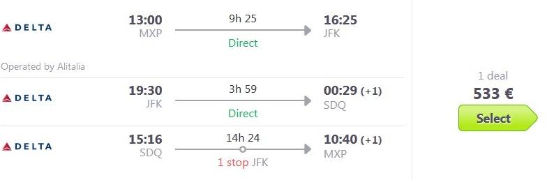 Milano (MXP) – New York (JFK) – Santo Domingo (SDQ) – Milano (MXP), že za 533 eur (angl povezava skyscanner)