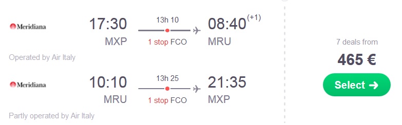 Informacija o letu: 1 postanek, prtljaga vključenaMilano (MXP) – Mavricij (MRU) – Milano (MXP), že za 465 eur (angl. povezava skyscanner)