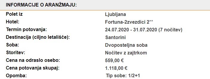 Skupna cena celotnega paketa 7 dnevnega dopusta za dve osebi (letalo + nastanitev) na Santoriniju tako znaša 1118 eur (oz. 559 eur na osebo).
